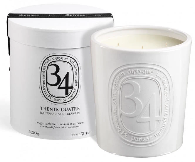 The 34 Boulevard Saint Germain candle has a scent which reveals itself as fresh, green and spicy accords. Damp mosses, crumpled blackcurrant leaves, sun-dried fig leaves all favorite raw materials.
