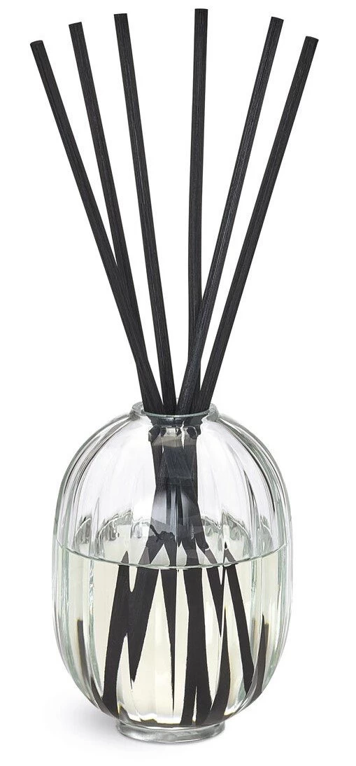 Diptyque Home Fragrance Diffuser perfumes a room while adding decorative flair. Its faceted oval glass vessel, in the emblematic shape of the Maison, creates a prismatic effect in which the fine rattan reeds appear multiplied. Glass, perfume and rattan become one, bringing a touch of poetry to any indoor space.
